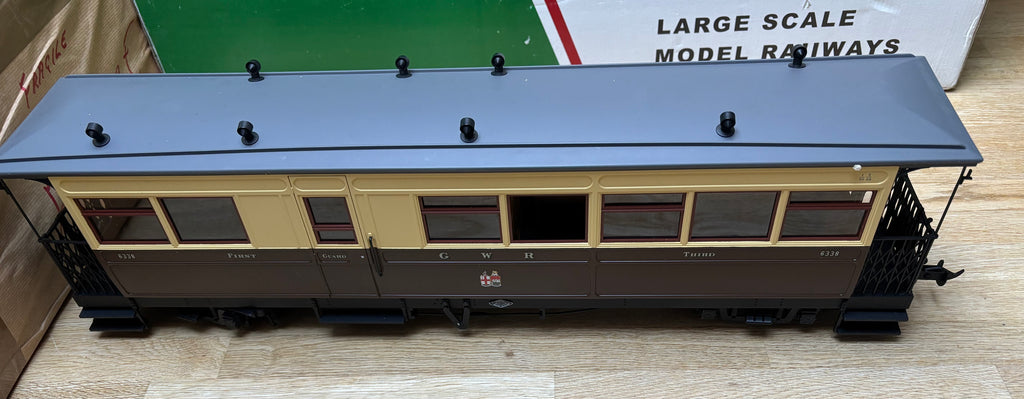 Here we have an Accucraft 16mm scale, 32mm gauge Welshpool & Llanfair 3rd Brake Composite coach Pickering Coach.